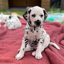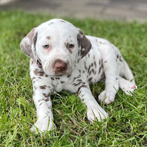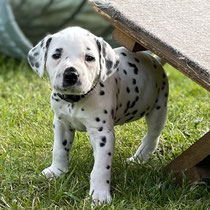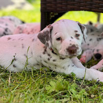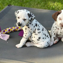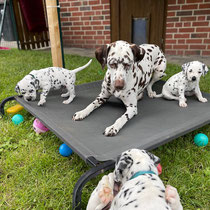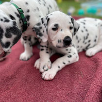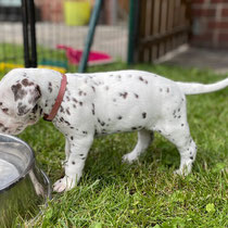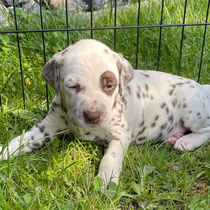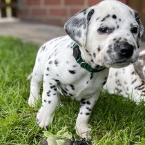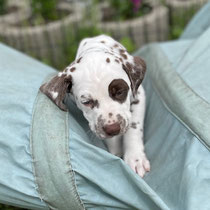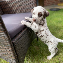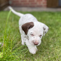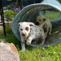 Sie genießen das schöne Wetter und gehen schon selbständig vom Welpenhaus durch die Klappe in den Garten und erkunden alles.
